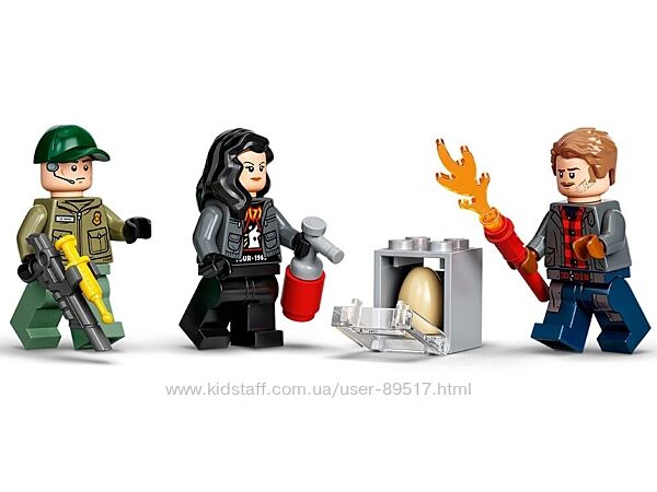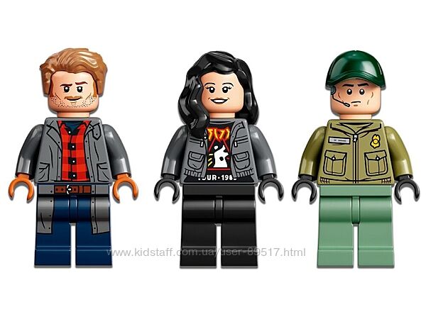 набор входят три минифигурки: Оуэн Грэди, Зия Родригес и сотрудникслужбы охраны природы — с элементами аксессуаров, такими как яйцодинозавра и рация, чтобы вдохновить на творческую игру.