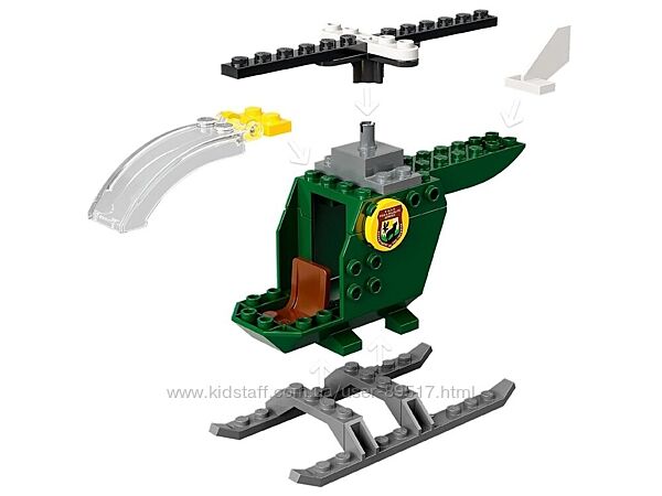 вертолёт, багги и фигурку тираннозавра. Три минифигурки LEGO® — Оуэн Грэди, Зия Родригес и сотрудник службы охраны природы с элементами