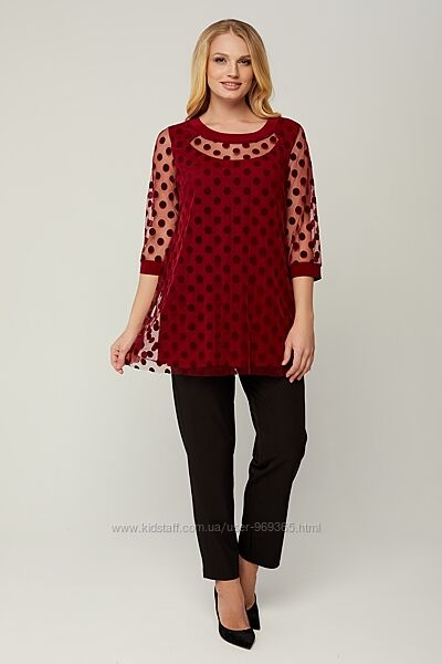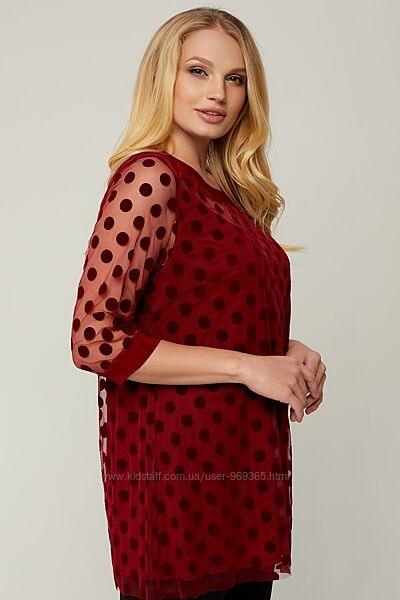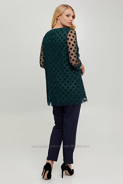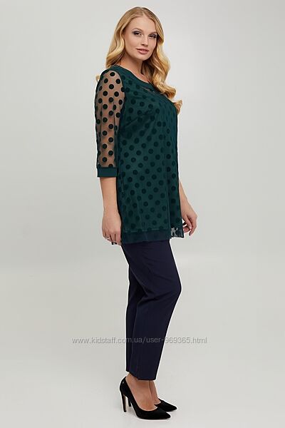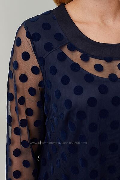 Женственная блуза трапециевидного силуэта. Рукав 3/4 на манжете. Блуза выполнена из ткани - сетка в горох, подкладка - трикотаж масло. Представленная блуза подойдет для повседневной носки и для праздничных дней.