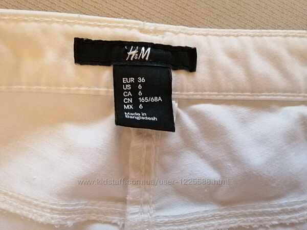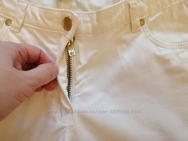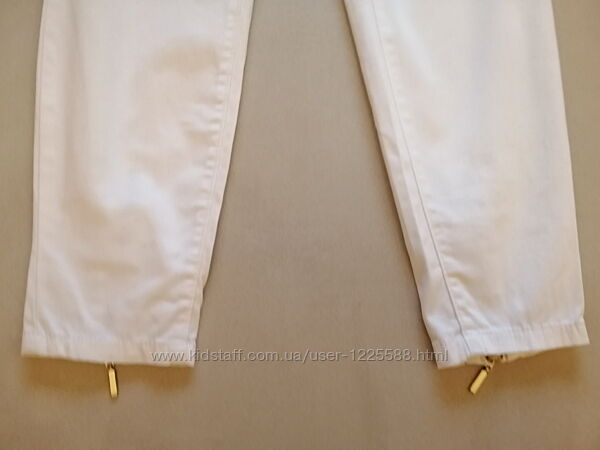 Ідеальний стан, тканина м´яка літня, майже не тягнеться. Гарні замочки позаду штанок, полегшують вдягання Виробництво: Бангладеш Розмір вказаний 36 євро, підійде на S-M Заміри: Напівобхват талії 37-40 Напівобхват стегон 46-50 Довжина 86, крокова 66 Посадка середня 19/30 Ширина стегна зверху 25 Ширина внизу 12