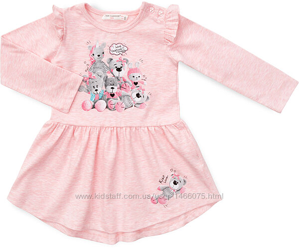 Симпатична трикотажна сукня з іграшками.Симпатична меланжева сукня, з довгими рукавами, прикрашена ніжним, різнобарвним, ефектним принтовим малюнком з глітерним напиленням у вигляді симпатичних іграшок – ведмедиків та зайчиків.