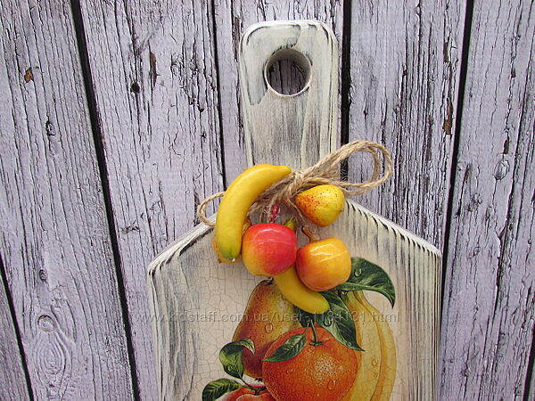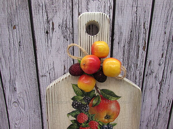 Дошка прикрашена мотузкою зі штучними фруктами.
