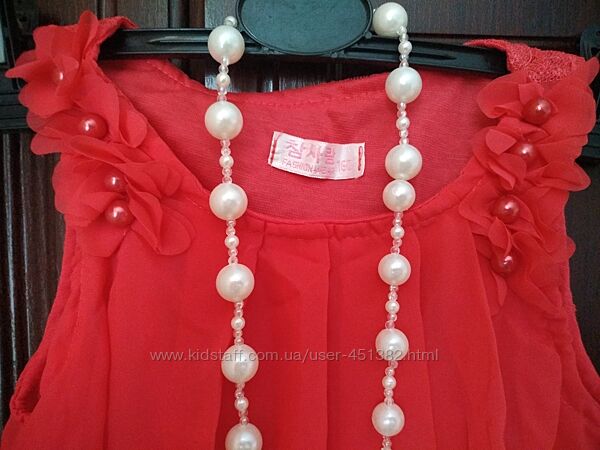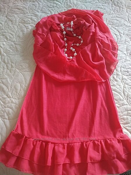 Нарядный сарафан на 8-10 лет. Замеры: длина изделия по спинке 75 см, ПО под мышками 35 см, ПО в области талии 42 см.Легкое, воздушное платье свободного кроя, придется по душе как ребенку, так и его родителям. В комплекте с бусами. На последнем фото показала подкладку, поверх которого легкий шифон. На верхней части спинки гипюр.