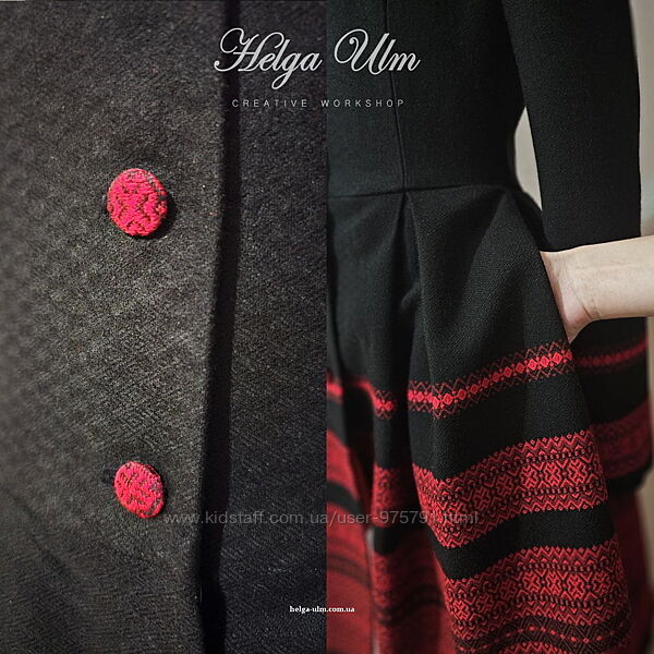 Сонячний жовто-оранжево-червоний орнамент на чорному тлі, вишиті ґудзики, внутрішні приховані кишені яскраво-червоного кольору.