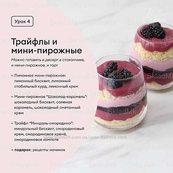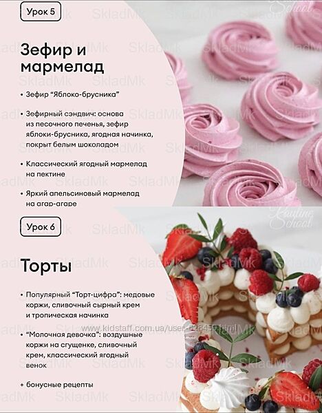 — Списки продуктов к каждому уроку, рекомендации. (И также бонусом лекция: как фотографировать десерты, и мини-курс «Осенние десерты»).