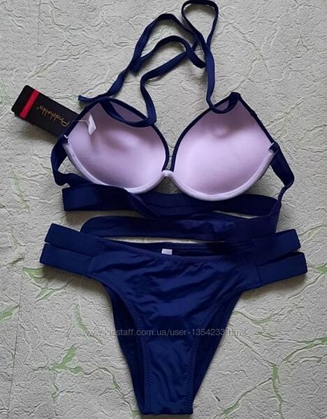 Стильные купальники, 2 расцветки: темно синий и черный отличного качества материала и пошива. Бренд Andzhelika. Бюстгальтер с твердой чашечкой с объёмным пуш-ап. Сзади и на шее завязывается. Трусики бикини полностью на подкладке.Размеры: