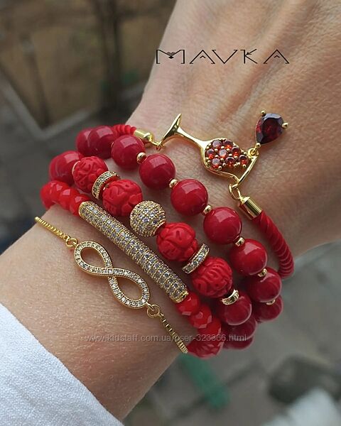 Сет з 5 браслетів "Келих червоного"Корал, намистини смола, кришталь, преміальна фурнітура інкрустована фіанітами.
