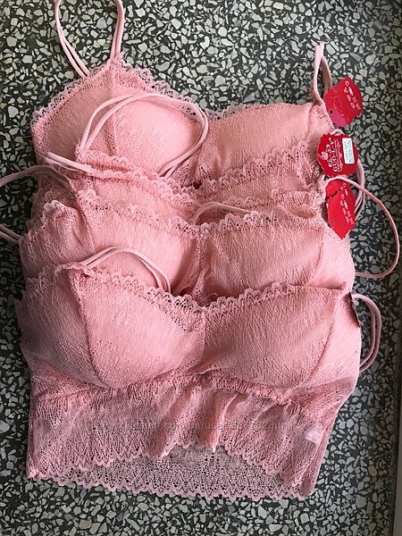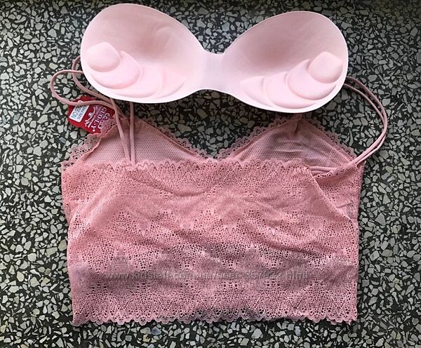 Нежный, красивый кружевной топ на тоненьких эластичных бретельках, с широкой кружевной спинкой. Модель очень удобная, кружево мягкое не колется. Чашка В. Цвет нежно розовый.Подойдет на объем от 75 до 85