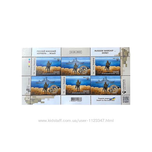 Весь последний месяц едва ли не каждый украинец охотился за маркой, символизирующей несокрушимость украинского духа. К сожалению, не все успели ее приобрести, а потому «Укрпошта» анонсировала продажу новой серии марок «Русскій воєнний корабль…всьо!». Она посвящена отпору корабля «москва», который потопили украинские защитники.... Ее название – слова украинских защитников острова Змеиный в ответ на российский корабль, которые стали символом сопротивления военной агрессии РФ.Характеристики: