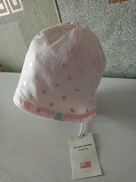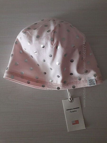 Шапочка трикотажная, двойная (внутри белая трикотажная подклада). Цвет розовый в серебристый горох. Смотрится красиво, нарядно. Натуральное волокно - 95% хлопок, 5 % эластан.Размер производителя 46 (примерно до 10/11 месяцев, обхват головы до 43,5/44, не больше!- меньше можно)