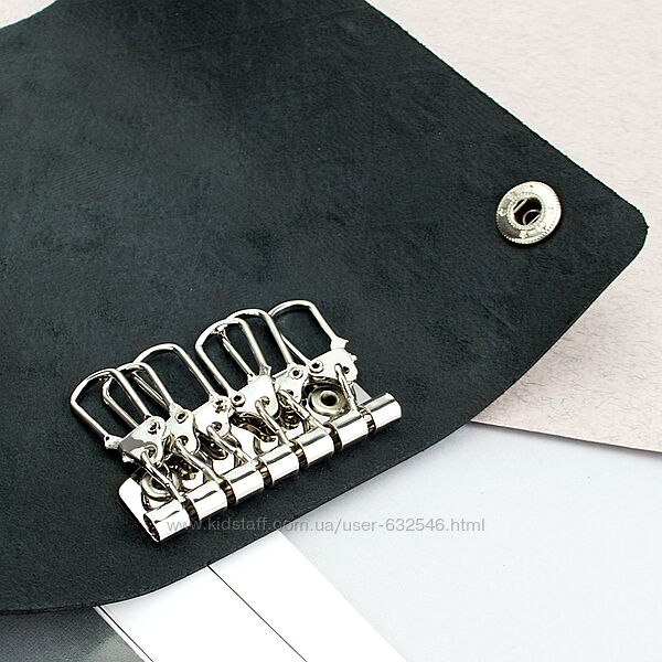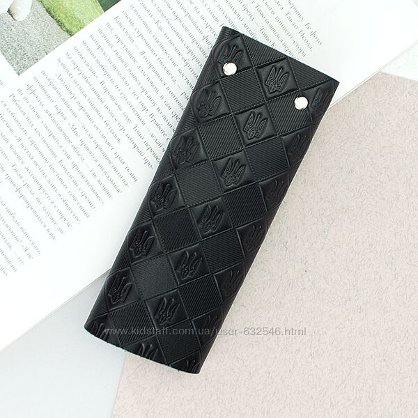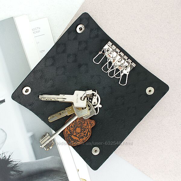 Шкіряна ключниця із натуральної шкіри з нової колекції HandyCover "Тризуб" стане чудовим подарунком для патріота України. Аксесуар дозволяє менше возитися з пошуком ключів та захистить сумку від небажаних пошкоджень. Ключниця виконана з натуральної щільної глянсової шкіри Кайзер чорного кольору. Малюнок у вигляді ромбів з тризубцями нанесений за допомогою тиснення, стійкий до подряпин. Усередині має металеве кріплення з 6 карабінів, закривається на кнопки. Підходить для ключів до 10,5 см в довжину. Розмір: 14,5*5,5*2 см. Виробництво - Україна. Продається в подарунковій крафтовій коробці.