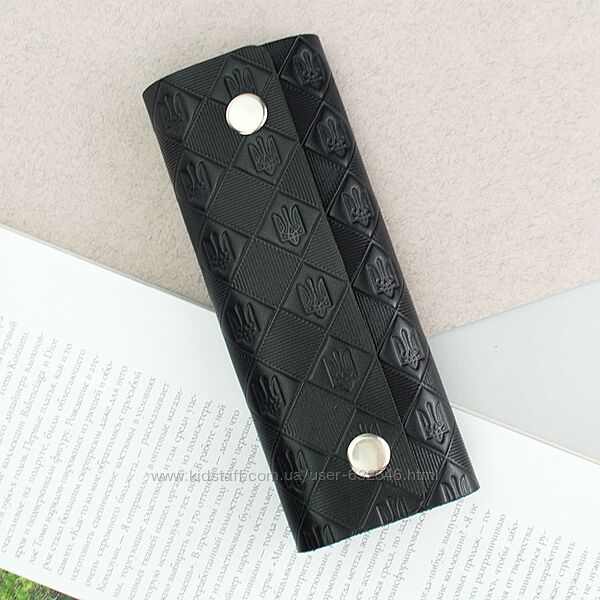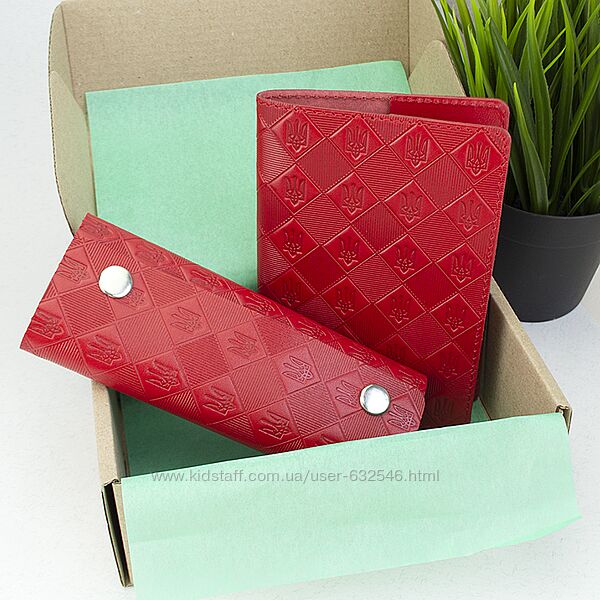 Подарунковий набір складається з гаманця та обкладинки на паспорт. Обкладинка на паперовий паспорт або закордонний паспорт стандартного розміру 9,5*13,3 см. Ключниця з натуральної шкіри захистить підклад сумки від пошкоджень ключами і її легко знайти серед інших дрібниць. Розмір: 14,5*5,5*2 см. Малюнок у вигляді ромбів з тризубами нанесений за допомогою тиснення, стійкий до подряпин. Набір виготовлений з натуральної цілісної 100% глянцевої шкіри Кайзер. Купуючи ці товари у наборі ви заощаджуєте 10%! (порівняно з вартістю товарів, придбаних окремо) Набір продається в подарунковій фірмовій картонній коробці. Всі товари в наборі виготовлені в Україні.
