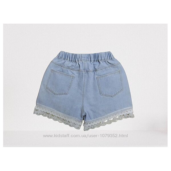 Качественные шорты для девочки.Талия на резинке с имитацией застежки.Высокая посадка. Есть карманы сзади и спереди.По низу рванка и украшены нежным кружевом. Смотрятся очень модно! Отлично сидят на ребенке. Эти стильные шорты станут чудесным дополнением к гардеробу вашей модницы. Ткань: джинс,100% cotton Цвет:голубой Размер:указан рост 110 см,большемерит,подойдут и на 6-7 лет Замеры: ПОТ - 24/34 см ПОБ - 35 см длина - 29 см Состояние: нового