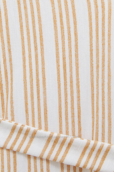 Прямой фасон. В состав входят хлопок и лен. Принт в полоску. Круглый вырез горловины. Короткие рукава. Эластичный пояс. На поясе хлястики. Съемный пояс. Спереди застежка на пуговицы.