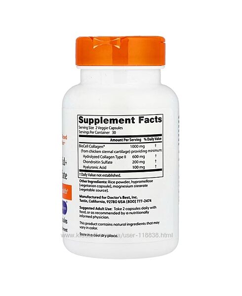 Гиалуроновая кислота и хондроитина сульфат от Doctor´s Best содержит патентованный коллаген BioCell — диетический ингредиент, в котором содержится патентованная смесь гидролизованного коллагена типа II природного происхождения, хондроитина сульфата и гиалуроновой кислоты в хорошо усваиваемой форме.