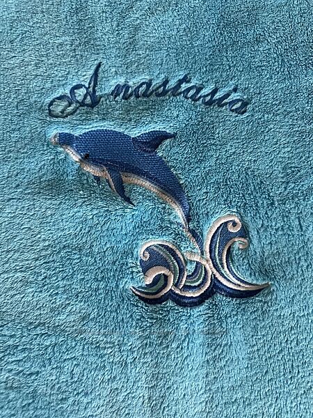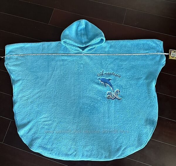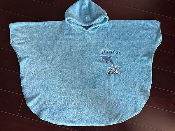 Пончо пляжное, банное , в идеальном состоянии , шитое на заказ , очень мягенькое, шитое на заказ с вышитым именем и рисунком , по бокам ( в области рукава) заклепочки, длина по плечу - 40 см , от левого конца пончо до правого - 99 см, , длина от плеча к низу 65.5 см.Другие объявления продавца