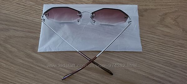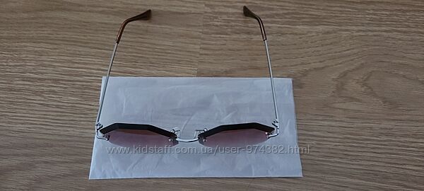 Продам новые солнцезащитные очки без оправы для женщин. Форма восьмиугольная, тонированные линзы, металлические тонкие дужки. Цвет коричневый. В наличии есть мягкий чехол и салфетка для протирания стёкол.Длина 137 мм, высота 58 мм.