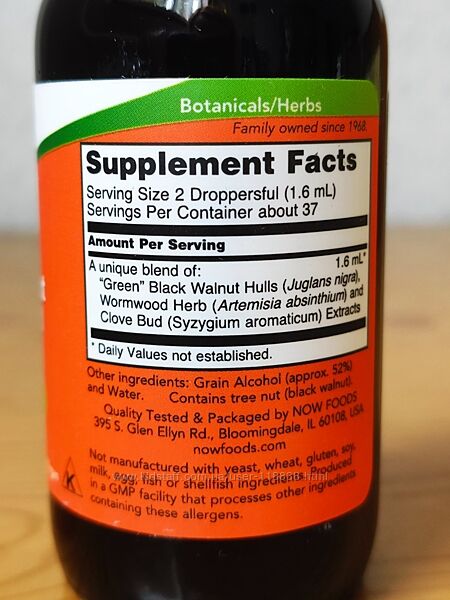 # Now Foods, Комплекс незрілого чорного горіха та полину, 59 мл«Комплекс свіжого (зеленого) чорного волоського горіха і полину» від Now Foods має рослинну формулу, що поєднує три традиційні рослинні екстракти в одній зручній рідкій добавці. Цей продукт виготовляється з додаванням екстрактів шкаралупи свіжого (зеленого) чорного горіха (Juglans nigra), полину (Artemisia absinthium) та бутонів гвоздикового дерева (Syzgium aromaticum).