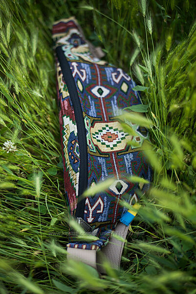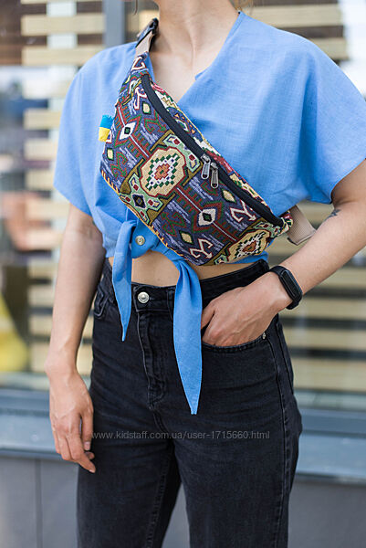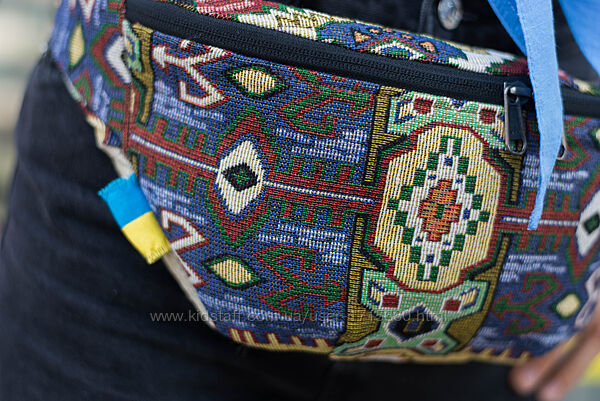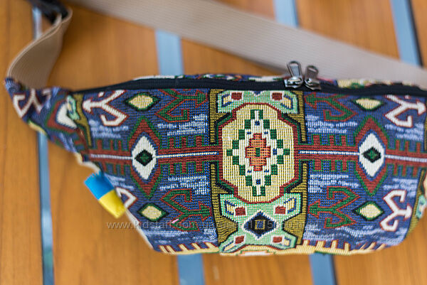 Склад: льон, бавовна, гобелен, блискавка YKK, фастекс WJ. ширина- 35 см. висота- 17 см. Розмір сумки + - 0,5 см. Сумка-бананка з текстилю: має дві кишені на блискавці. Сумка закривається на
