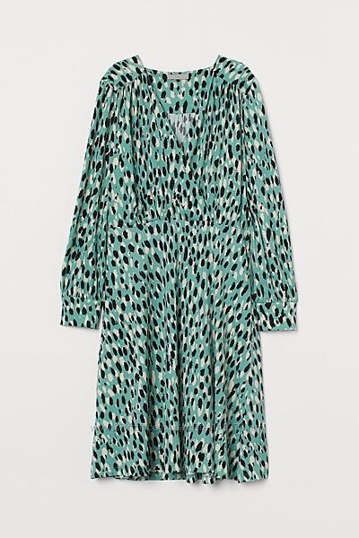 V-образный вырез с пришитым запахом сверху и присборенными швами на плечах и талии для создания эффекта легкой драпировки.
