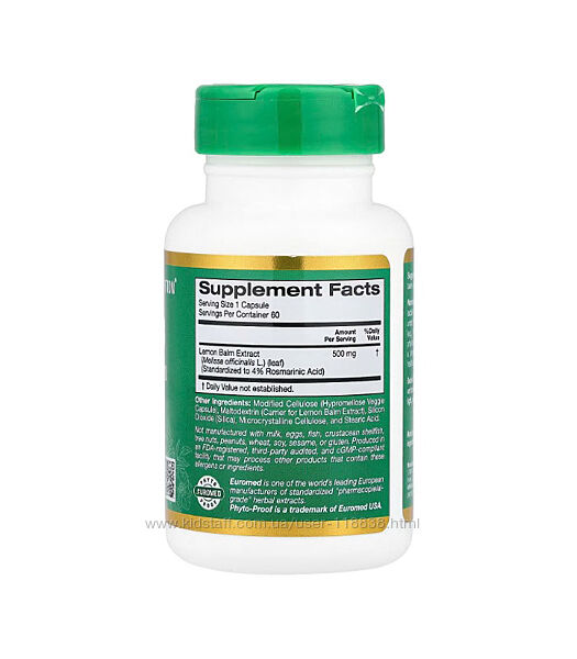 Подробное описание: California Gold Nutrition, екстракт листя меліси, 500 мг, 60 капсул