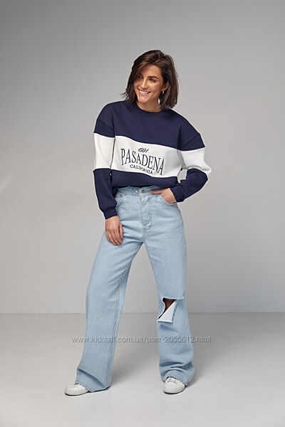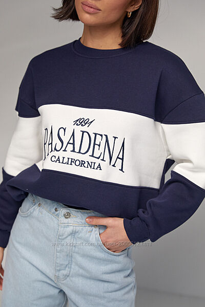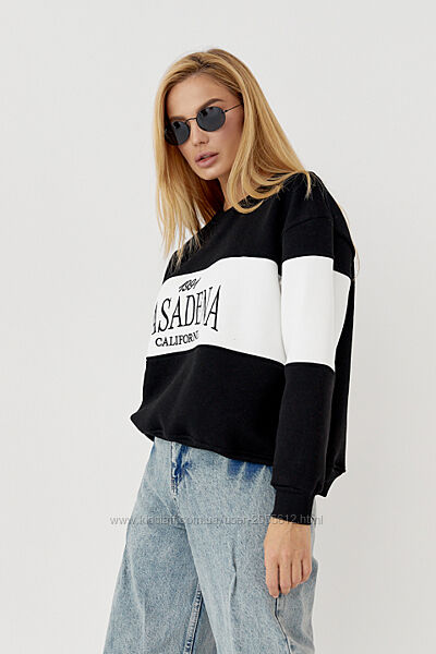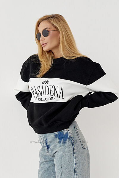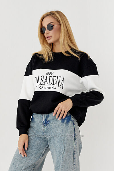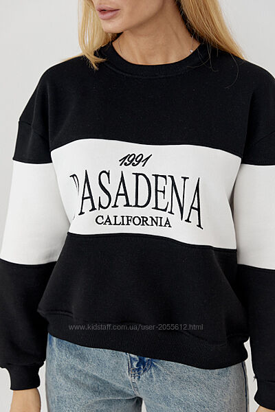 Модель зшита з теплого трикотажу з начосом та спереду по центру виробу, а також на рукавах прикрашена широкою вставкою контрастного кольору. Також спереду розташований вишитий напис "1991 PASADENA California". Кругла горловина світшота обшита бейкою в тон до виробу, а прямий низ та довгі рукави закінчуються манжетами.Заміри: