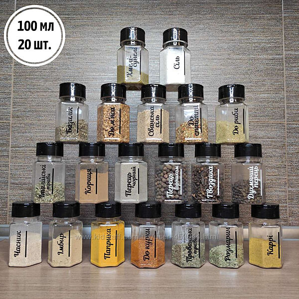Пластикові контейнери зберігають смак і запах Ваших улюблених спецій.Набір складається з 20 баночок по 100 мл.