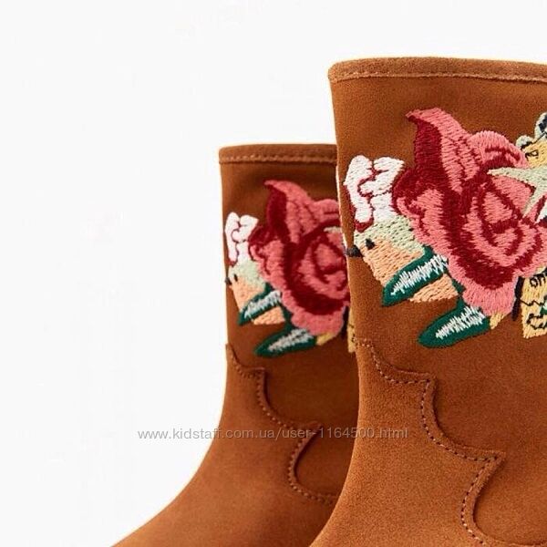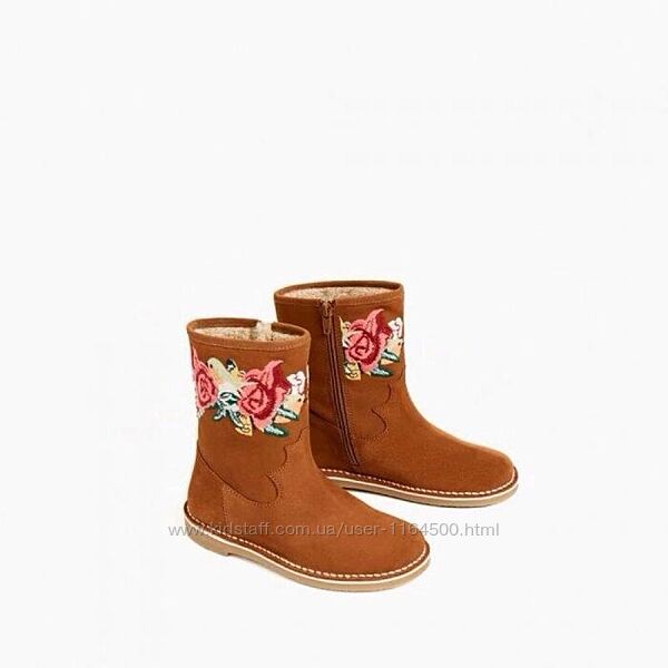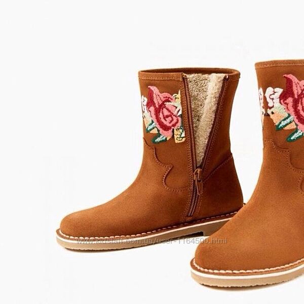 Замшеві чобітки на хутрі для дівчинки. Зовнішня тканина: натуральна замша. Всередині чобітки утеплені хутром. Застібка: блискавка. Взуття укршене вишивкою. Заміри: 26р - устілка 16 смБрендовий магазин Zara Іспанія