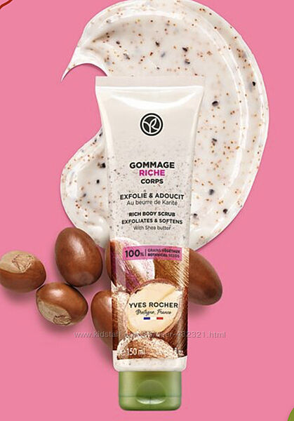 Гомаж Yves Rocher живлення для тіла каріте, Франція, 150 млЗбагачений олією Каріте та часточками шкаралупи горіху Каріте, ексфоліюючий Скраб із ультраживильною текстурою делікатно видаляє ороговілі клітини шкіри. Усього за один крок шкіра відновлена та почувається комфортно!