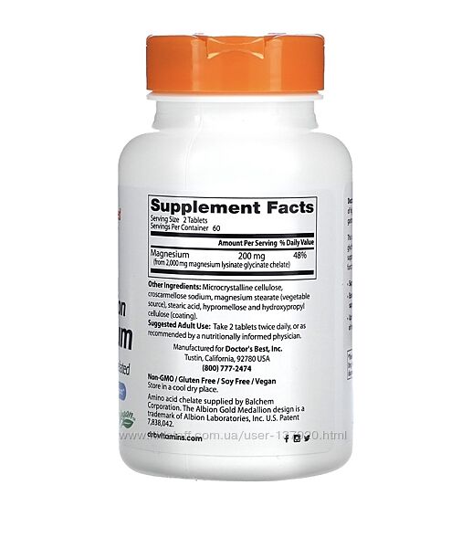 ОписScience-Based Nutrition™Підтримка здоров’я кісток, серця, нервової системи та м’язівДієтична добавкаВеганські продукт, без ГМО, глютену і соїКапсули Doctor´s Best з магнієм у хелатній формі забезпечують легку для прийому добову дозу легкозасвоюваного магнію, що не викликає шлунково-кишкових розладів. Цей чудовий склад з лізінатом і гліцинатом на 100% у хелатній формі ефективно засвоюється, підтримуючи розслаблення м’язів і оптимальну роботу нервової системи.