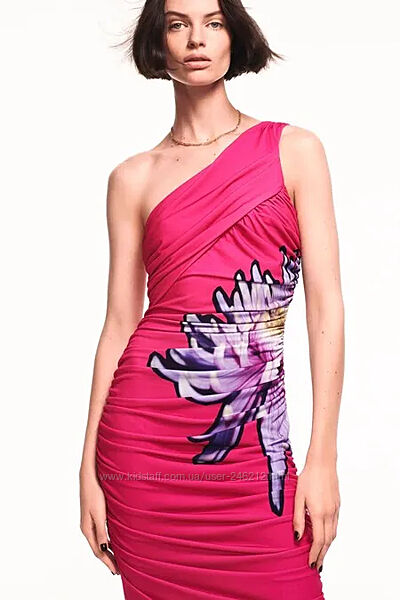 Ассиметричное платье Zara.Платье в драпировку , а сбоку принт цветка типа георгина.