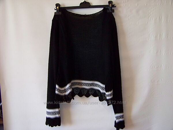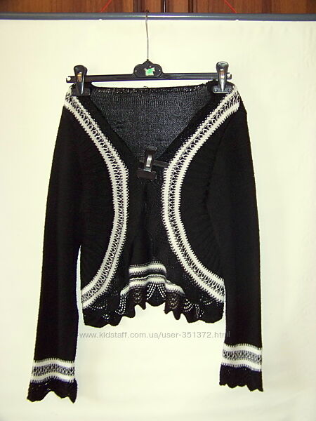 Черно-белая вязаная кофта накидка, выполнена из смеси шерсти и акрила в основном, тм Escamode, Турция, размер sm.Дефектов особых нет. Парочка затяжек, которые не заметны при носке. На фото все видно, в цене учтено! Кофта очень приятная к телу, нарядная. Мне, к сожалению, стала маленькой.