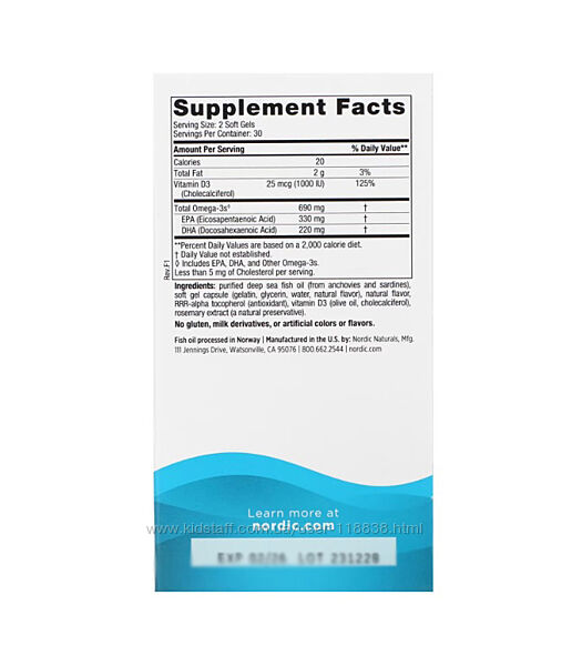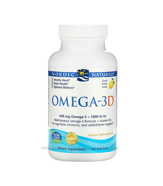 Omega-3D від Nordic Naturals містить 690 мг омега-3, а також 1000 МО вітаміну D3, що перевищує рекомендовану фахівцями добову дозу кожної з цих важливих поживних речовин. Ця потужна формула забезпечує комбіновану підтримку для здорової роботи серця та мозку, а також для покращення стану кісток, настрою та імунітету.