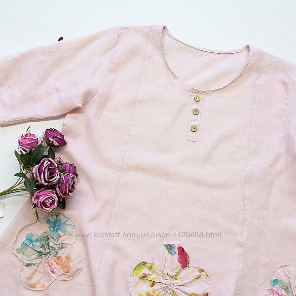 Вещичка необычная, в бохо стиле, удлиненная, свободного кроя. Выполнена из натуральной дышащей ткани в цвете "чайная роза", декорирована оригинальной объемной аппликацией. Рукава с подхватами, пуговки из натурального кокоса. Заметная акцентная эффектная. легко сочетается с любым низом.