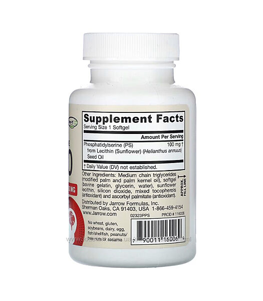 Фосфатидилсерин (ФС) — это натуральный фосфолипид, входящий в состав клеточных мембран. Фосфатидилсерин — самый распространенный фосфолипид, присутствующий в головном мозге и поддерживающий нормальную когнитивную функцию. Jarrow Formulas® Cogni-PS® — это концентрированная форма фосфатидилсерина из подсолнечного лецитина, которая обладает превосходной устойчивостью, не содержит сои и производится без использования генетически модифицированных организмов (ГМО).