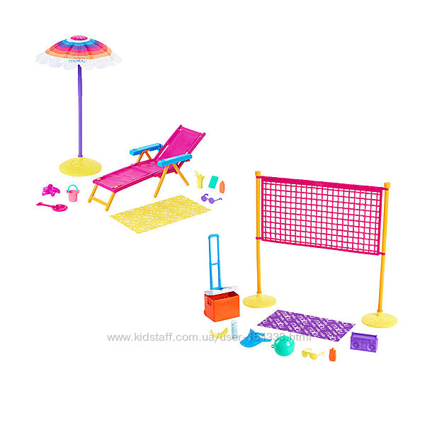 Игровые наборы Barbie Loves The Ocean Beach with Lounge Chair, Umbrella & Accessories и with Volleyball Net & Accessories.Проведите незабываемый день на пляже с игровыми наборами Barbie Loves the Ocean. Вместе с куклами Барби (продаются отдельно) вы можете расслабиться на шезлонге под радужным зонтиком и аксессуарами, идеально подходящими для летнего дня.