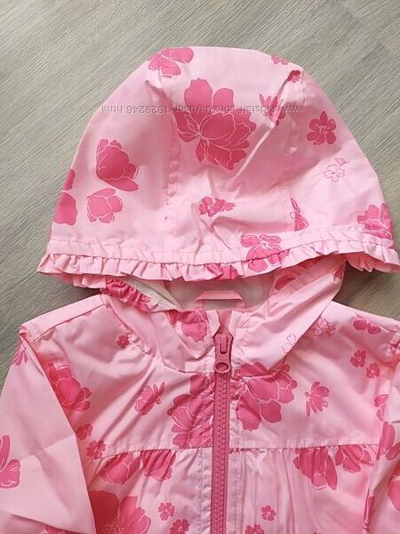 Прекрасные ветровка для девочки фирмы Carters. Вполнена в розовом цвете, повсюду цветочные картинки.Изготовлена из качественного водонепроницаемого и ветрозащитного материала. Оснащена удобным капюшоном, который дублирован трикотажной подкладкой, а по спинке, груди и рукавам – плащевая. Ветровка также украшена рюшами вокруг капюшона. Застёгивается молнией по всей длине. Есть защита у подбородка. На рукавах эластичные резиночки. Сборочка на груди. Функциональные боковые карманы.
