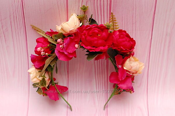 Обруч виконаний по типу кокошника. Квіти тканеві, композиція доповнена гілочками зелені та листочками. Пишний, святковий і нарядний. Підійде під вишиванку, доповнить образ на весіллі, фотосесії.Другие объявления продавца