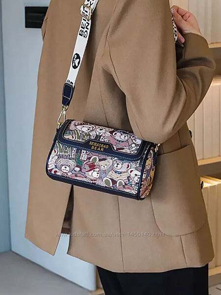 Жіноча сумка від бренду Beibaobao. Універсальна крос-боді на широкому ремені компактна і зручна у носінні. Виготовлена зі штучної шкіри високої якості. Малюнок "Ведмеді" тактильно та візуально нагадує вінтажну вишивку. Сумка вміщує всі необхідні речі, включаючи місце для телефону та гаманця. Невелика сумка за розміром: 21 х 14 х 10 см. Сумка маленька, але достатньо функціональна. Підходить для тих, кому не потрібно носити з собою багато речей. Її можна використовувати як клатч. Незвичайна та модна сумка точно сподобається сучасній дівчині або підлітку.Другие объявления продавца