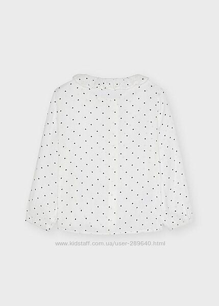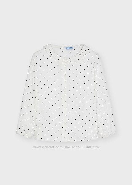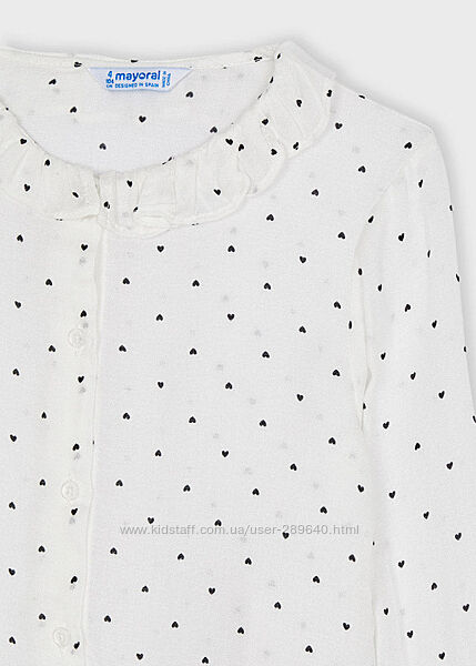 Белая блузка бренда Mayoral с изображением маленьких сердечек - прекрасно подойдёт как для повседневного стиля так и для праздничного, нарядного, школьного образа. Спереди изделие на пуговицах, воротник с волнистыми оборками. Блузка выполнена из 100% вискозы.Размеры в наличии: