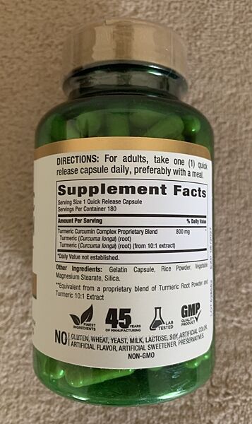 Комплекс з куркумою Turmrric curcumin 800 мг, 180 капсул, США.Харчова добавка - Turmeric Curcumin містить екстракт куркуми, який належить до природних антибіотиків, має знеболюючу, антиоксидантну, антисептичну, проти спазматичний, розсмоктуючу, бактерицидну, жовчогінну, загоюючу дію.