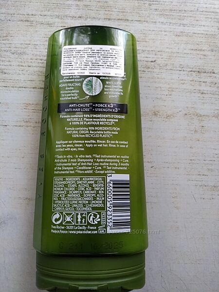 Уцінка! Бальзам-Кондиціонер для Укріплення та Росту Волосся з люпином yves rocher 200 ml Уцінка по терміну придатності, термін придатності до 11.2025р. Полегшує розчісування та зміцнює волосся в 3 рази Бальзам-Кондиціонер з екстрактом Білого Люпину полегшує розчісування, зміцнює волосся та підвищує його опірність пошкодженням. Краса волосся залежить від здоров´я шкіри голови. Тому кожна формула гами містить полісахариди Агави, що вперше використовуються в косметичних продуктах. Вони вдвічі покращують мікроциркуляцію* шкіри голови, насичуючи волосяні цибулини поживними речовинами, та, як результат, зміцнюють волосся та повертають йому природну красу. Його +: Завдяки легкій текстурі Бальзам-Кондиціонер можна використовувати по всій довжині волосся від коренів