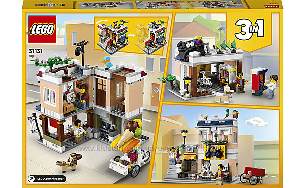 Фантастичні іграшки, які заохочують творчу гру. За допомогою цього конструктора LEGO Creator 3 в 1 діти можуть збудувати 3 різні моделі будівель. Діти можуть почати зі складання двоповерхового багатоквартирного будинку з магазином пельменів, квартирою та терасою на даху, а потім перетворити будівлю на магазин велосипедів, газетний кіоск та художню студію. Зрештою, набір можна перебудувати в ігрову кімнату з трьома ігровими автоматами. Звичайно, ви також можете побудувати щось зовсім відмінне від 569 кубиків, що входять до набору.