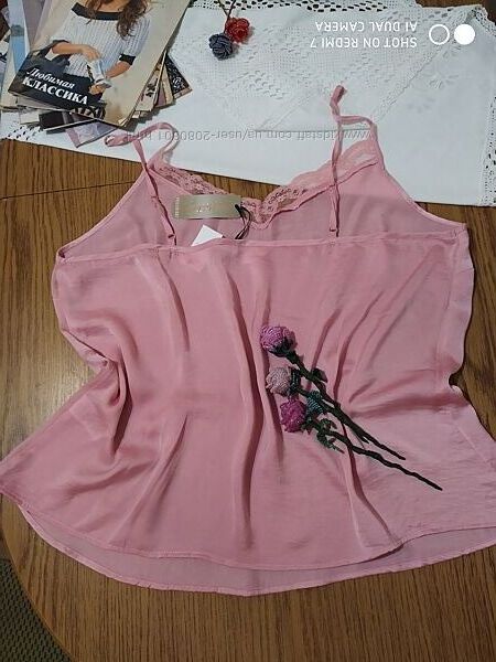 Класна домашня піжамна маєчка.Тканина тоненька віскоза,схожа на жатий шовк.Без нюансів Підійде на М-L,XLЗаміри по запиту