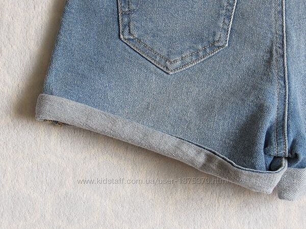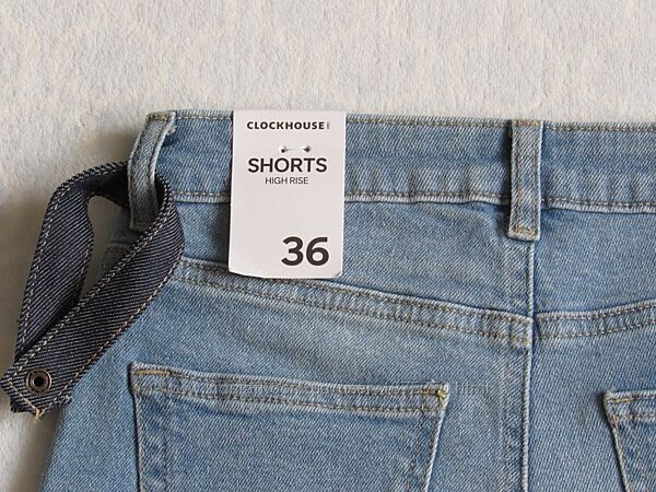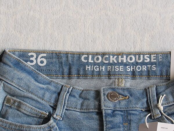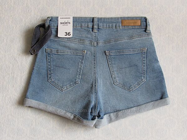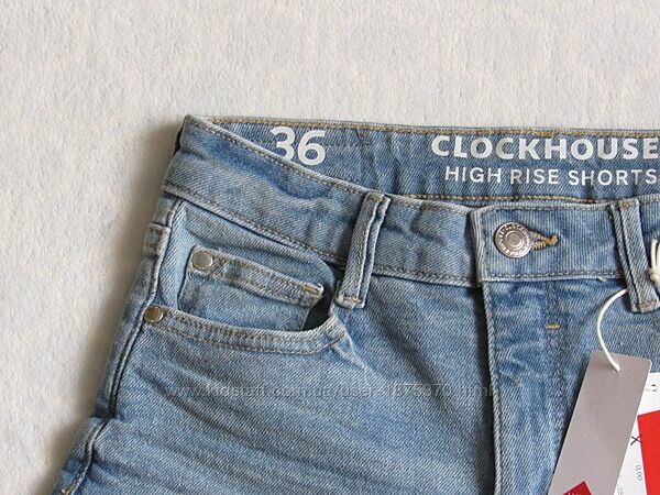 Нові джинсові жіночі шорти від фірми C&A Clockhouse. Стрейч. Висока посадка. Розмір європейський: 36 (наш приблизно 42) Склад: 99% бавовна, 1% еластан. Довжина виробу: 29 см, напівобхват талії: 32,5 см, напівобхват стегон: 42 см, висота посадки: 22 см, ширина штанини вгорі: 27 см, ширина штанини внизу: 25 см.