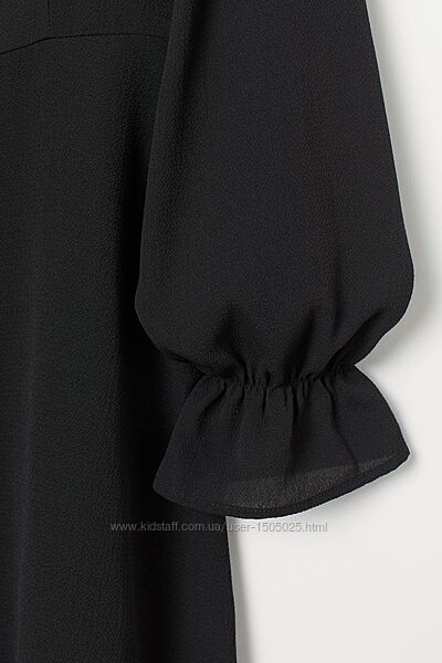 Бренд H&M (Эйч энд Эм)Короткое платье из креповой ткани. На платье круглый вырез горловины и разрез сзади с пуговицей. Длинные рукава с узкой резинкой и оборкой снизу.