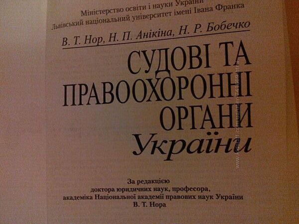 1, Судові та правоохоронні органи України В.Т.Нор 2010 р.В навчальному посібнику розкриті загальні положення про правоохоронну систему органів, до якої належать суди, прокуратура, органи досудового розслідування, органи виконавчої влади, що реалізують державну політику в тій чи іншій сфері правоохоронної діяльності: Міністерство внутрішніх справ, Міністерство юстиції, Служба безпеки України, державна виконавча служба, адвокатура, нотаріат та інші установи. Структура посібника визначена навчальною програмою дисципліни та побудована на найбільш оптимальному та легкому поданні матеріалу студентам - у запитаннях і відповідях, при цьому відповідь на питання викладена та розкрита чітко, стисло та зрозуміло. Навчальний посібник розрахований на студентів, слухачів, аспірантів юридичних пачальних закладів.