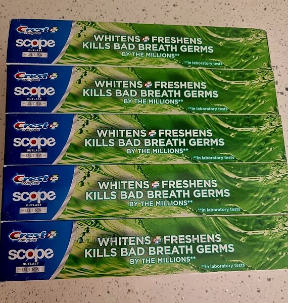 Зубная паста имеет новую формулу, которая убивает миллионы частиц неприятного запаха из рота и обладает долговременной свежестью Scope Outlast, так что вы можете чувствовать себя ультрасвежими до 7 раз дольше. Эта зубная паста помогает бороться с кариесом и зубным камнем, одновременно удаляя поверхностные пятна. Лабораторные испытания в сравнении с обычной зубной пастой.