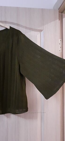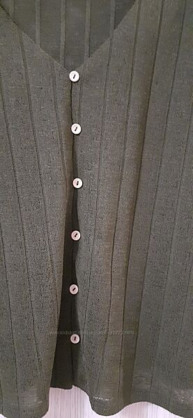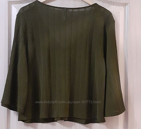 Укороченний кардиган H&M розмір L, але чудово підійде і на ХL. Склад - 100% поліестер. Тоненький і приємний на дотик. Колір: темно оливковий.Заміри: ширина плечей - 47 см, довжина рукава - 41 см, півобхват грудей - 54 см, півобхват талії - 57 см, довжина- 50 см