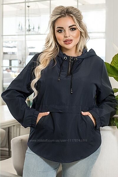 Легка курточка – штормівка, на підкладці, викрнана в стилі худі. Без застібки, з накладною кишенею «кенгуру» та капюшоном на завязці. Рукава внизу на резинці.